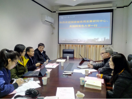 2018年1月12日上午,国家邮政局“邮政业与美国阿肯色大学合作”项目来我院召开座谈会。美国阿肯色大学JohnKENT教授、国家邮政局发展研究中心顾春晖研究员、南京邮电大学现代邮政学院孙知信院长、曹亚东副院长、国际交流合作处张舒老师等参加了座谈会。座谈会由孙知信院长主持。
