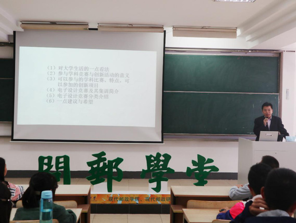 张主任首先向同学们分享了大学学习的经验,提醒同学们要主动学习、积极探究,培养主人翁意识;随后,张主任强调了学科竞赛与创新活动的意义,参加各类科创竞赛活动既有助于提升动手技能,也有助于培养合作意识、拼搏精神,更可为将来的保研创造机会。接着,张主任重点介绍了学科竞赛以及创新项目的类别,通过图片与在座同学分享我校历年学科竞赛中的辉煌成绩,并播放了我校历年电子竞赛的部分优秀作品。张主任鼓励同学们积极参与到学科竞赛中,延续南邮悠久的科研创新传统。