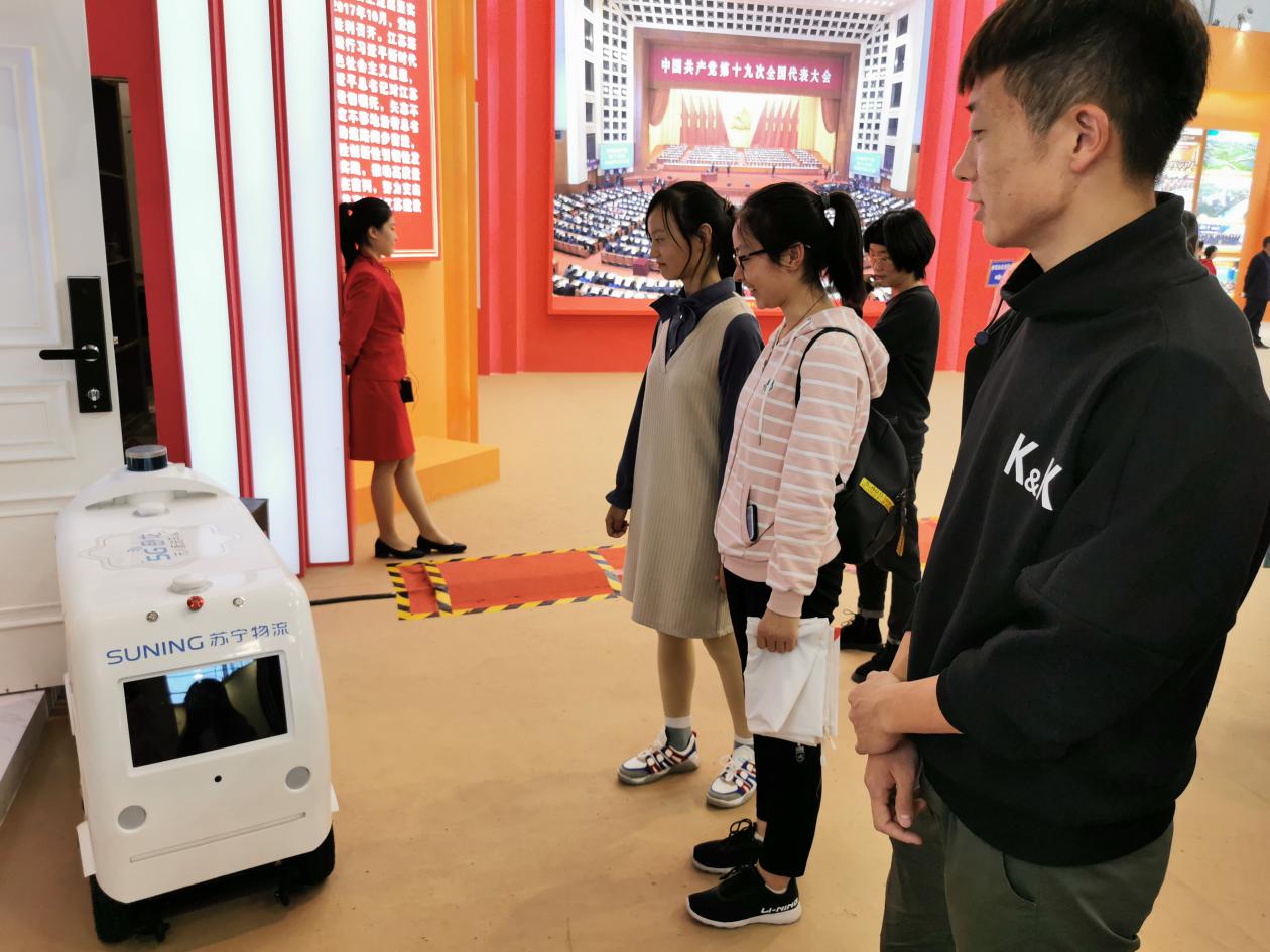 本次主题成就展通过典型图片、实物模型、场景还原、动态演示、互动体验等多种方式,生动展示了在党中央的正确领导下,新中国成立70年来江苏建设、改革、发展的伟大历程。参观展览的同学们被江苏在科技、教育、工业、农业、医疗、城市建设等各方面获得的巨大成就所震憾。做为邮政、物流业的储备军,大家在看到观展室内陈列的苏宁5G“卧龙”无人车和京东配送机器人3代十分欣喜,大家感受到智慧物流的迅猛发展,也切实体会到计算机、人工智能的研究为如今人民生活提供的诸多便利。