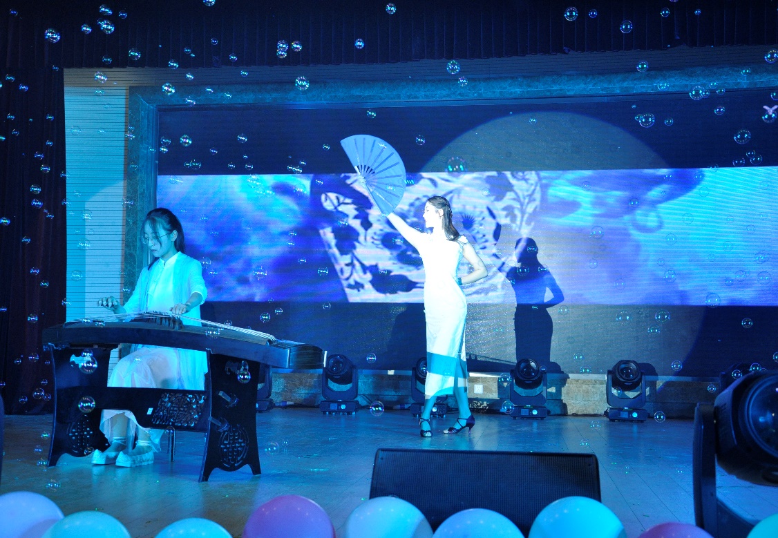 天青色等烟雨,而我在等你。古筝声起,若泉水叮咚,流过桥头,流过青砖。月下的女子轻舒云手,彩扇飘逸,若仙若灵。《青花瓷》落下帷幕,古典艺术的韵味令人陶醉,琴弦的余音依旧回响在耳畔。