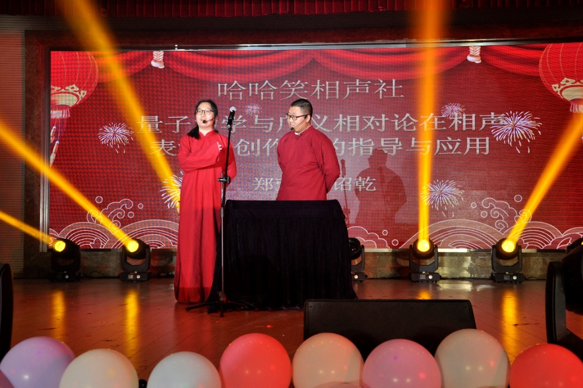 当量子力学与广义相对论与相声巧妙融合,相声中“四维空间”风趣应用,不断重复回放的动作,让人捧腹大笑,引起同学们的阵阵掌声。原本复杂的科学知识在两位同学的演绎中妙趣横生,勾起同学们对科学的好奇与探求知识的渴望。