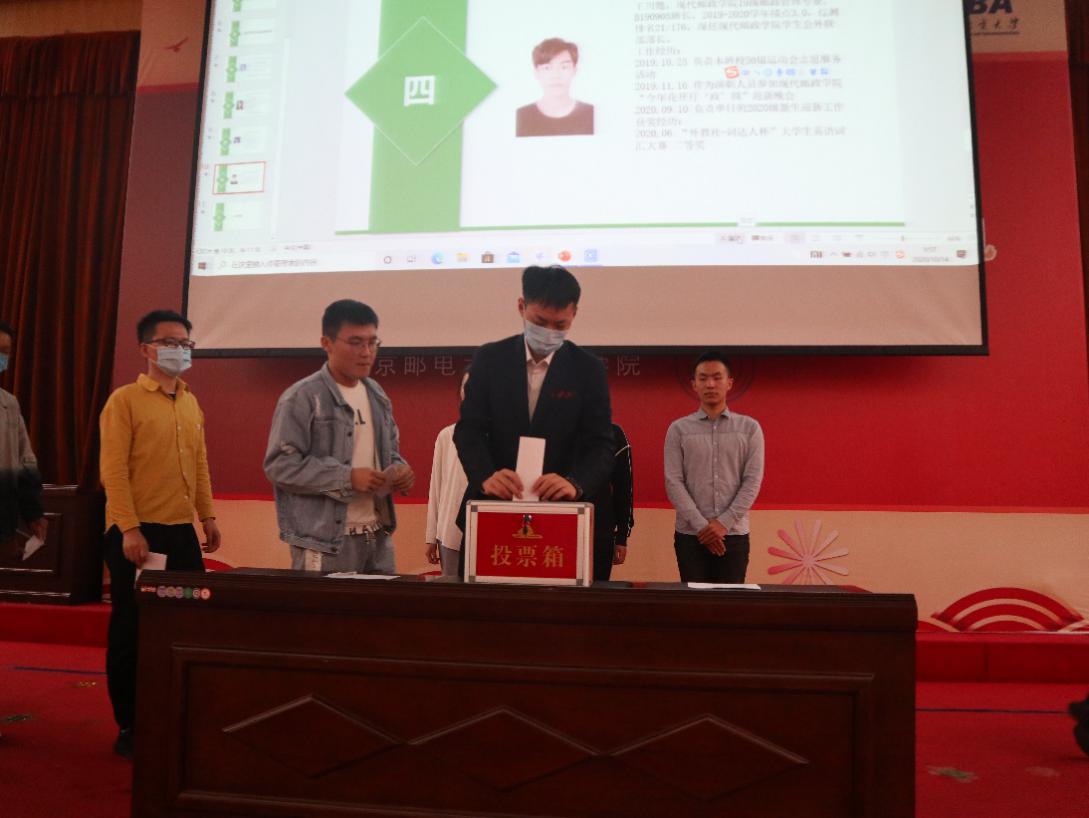 会议第三项议程为选举南京邮电大学第十七次学生代表大会代表,在主持人张凌瑶宣读投票规则后,工作人员分发选票,现场进入严肃紧张的投票环节。在监票团公开唱票后,最终以有效票23票,无效票0票选出靳慧慧、缪徐奇、桑行立等七人作为代表。会议进入第四项议程选举现代邮政学院主席团成员,候选人为谈馨、张凌瑶、秦嘉宁、王川懿。在主持人张凌瑶介绍各候选人简介、成就、工作经历后,学生代表们经过深思,谨慎而郑重地投出他们宝贵的一票。在监票团公开唱票后,选举出谈馨、张凌瑶、秦嘉宁成为学院学生会主席团成员。到此,南京邮电大学现代邮政学院第一次学生代表大会正式圆满结束。