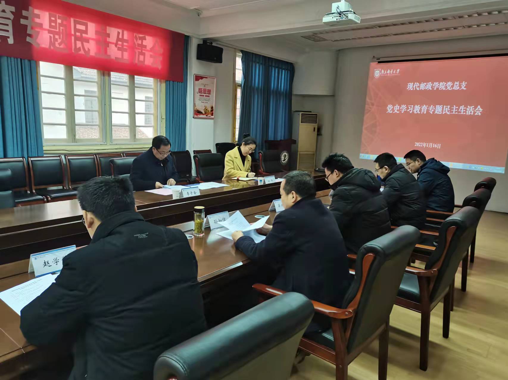 根据学校党委《关于开好2021年度党史学习教育专题民主生活会的通知》的部署要求,2022年1月16日下午,现代邮政学院党总支在三牌楼校区行政北楼学院207会议室召开党员领导干部党史学习教育专题民主生活会,校党委常委、纪委书记、省监委派驻南京邮电大学监察专员李子全、校党委常委、宣传部部长谢平出席会议并全程指导。学院领导班子全体成员参加了会议,会议由学院党总支书记薛晓华主持。