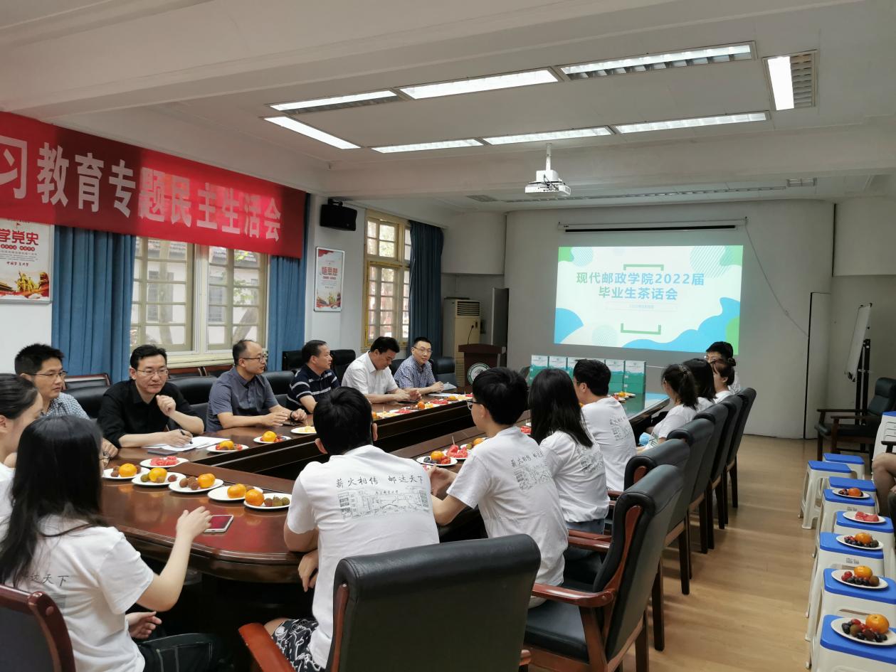 2022年6月8日上午,现代邮政学院在三牌楼校区行政北楼二楼会议室召开2022届毕业生茶话会,学院党政领导、系主任、院办主任、毕业班辅导员和学生代表近20人参与。会议由学院党委副书记、副院长刘星主持。