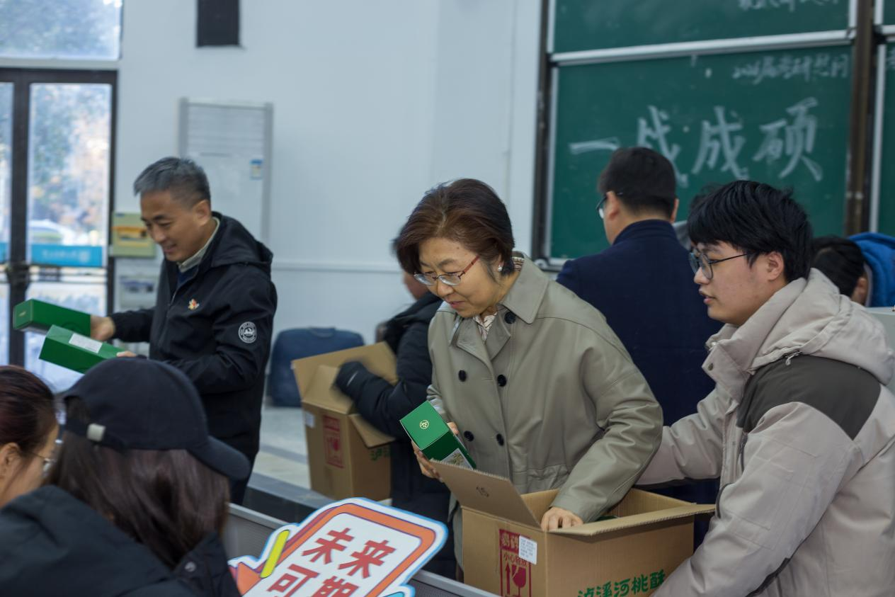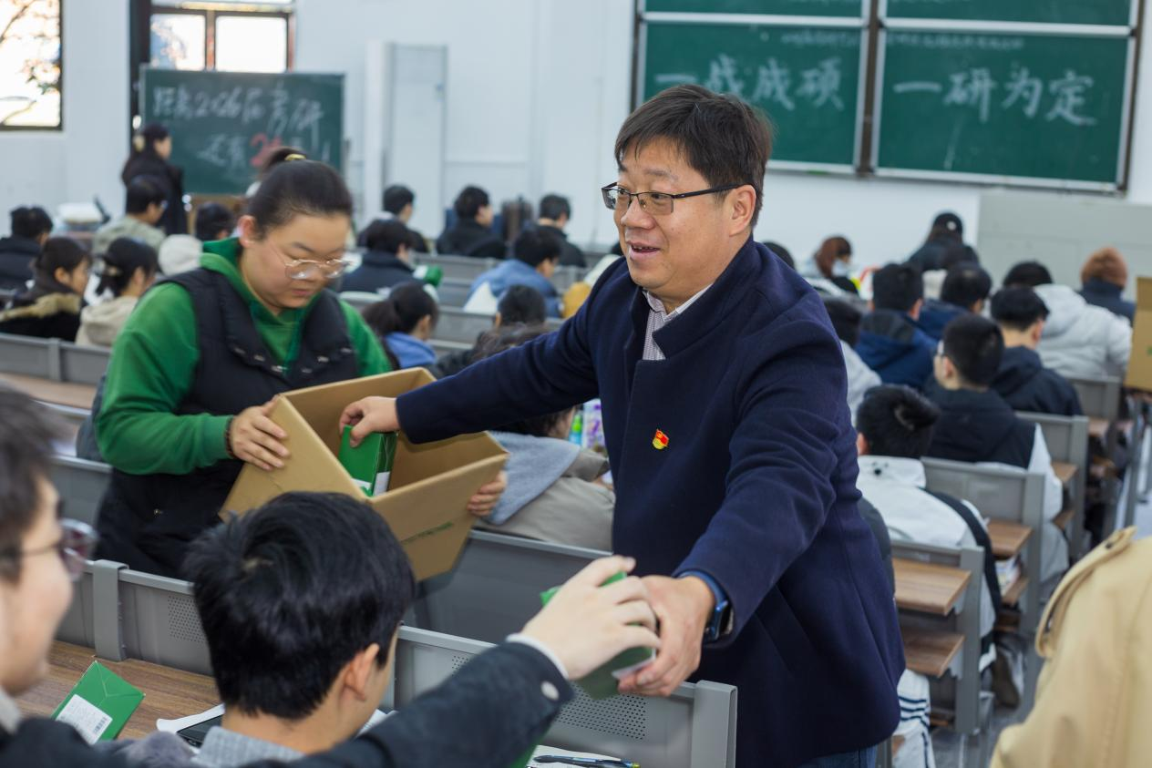 11月26上午,校党委常委、副校长姜小舜来三牌楼校区教东阶梯教室慰问我院考研学生,与我院院长张学军、党委副书记、副院长杜月林一道给我院80余名考研学生发放定制款状元桂花糕。