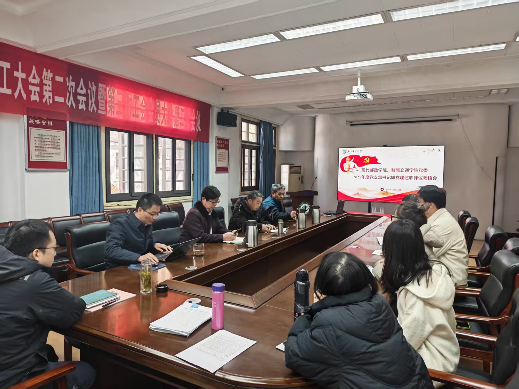 为全面总结2025年度党建工作,进一步强化支部党建工作责任制,推动基层党建责任落实,12月25日,现代邮政学院、智慧交通学院党委在三牌楼校区行政北楼学院207会议室召开2025年度党支部书记抓党建述职评议考核会。学院党委委员、党支部书记、组织员、党风联络员和党员代表参加会议。考核会由学院党委书记胡学忠主持。