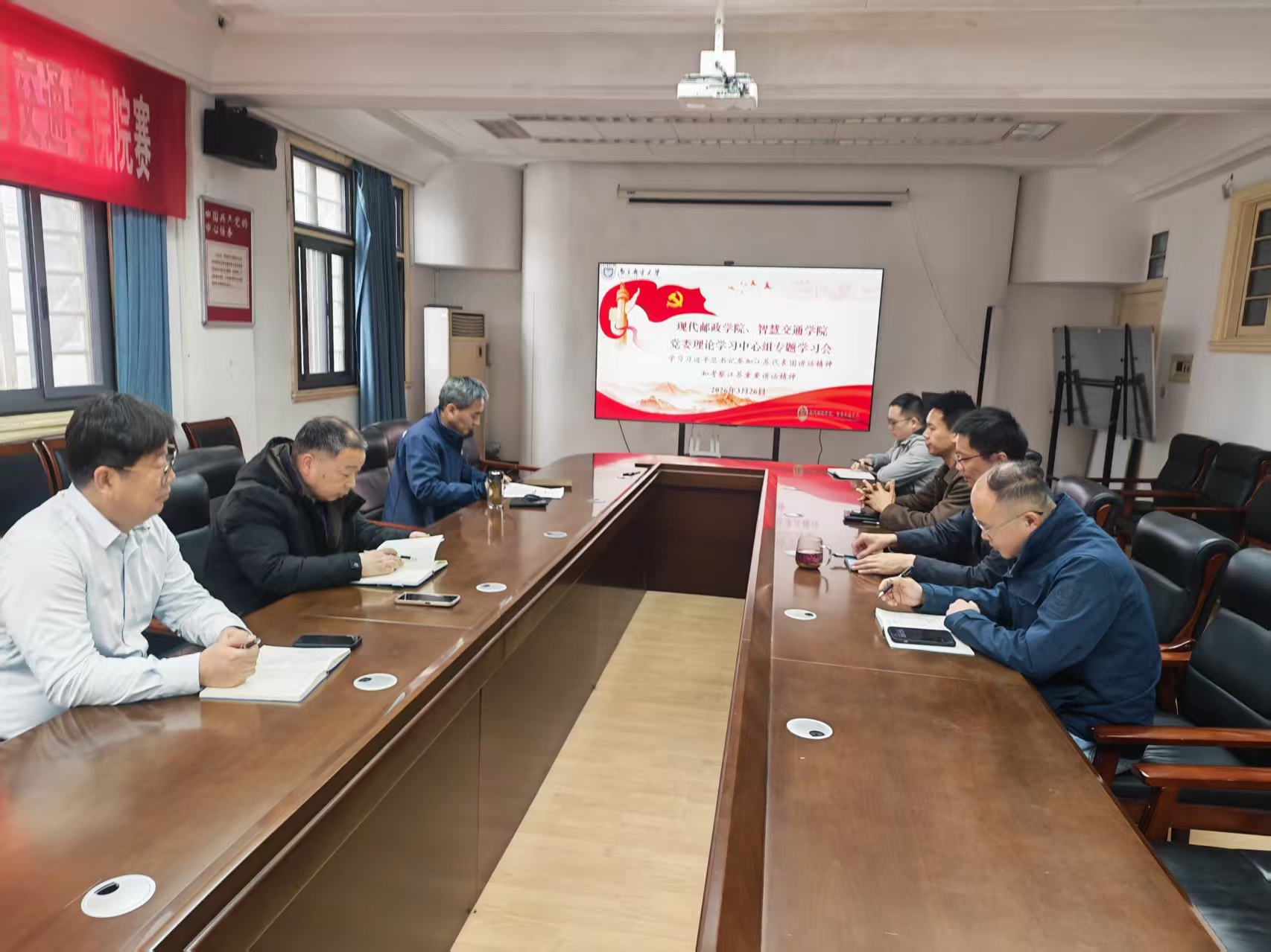 3月26日,现代邮政学院、智慧交通学院党委理论学习中心组在三牌楼校区行政北楼学院207会议室召开集体学习会,专题学习习近平总书记参加江苏代表团审议时的重要讲话精神和习近平总书记考察江苏重要讲话精神。学院党委理论学习中心组全体成员参加了会议,学院党委书记胡学忠主持会议。会上,中心组成员共同观看了《习近平在参加江苏代表团审议时强调 经济大省要在研究新情况解决新问题上下功夫出经验》《习近平在江苏考察时强调:在推进中国式现代化中走在前做示范 谱写“强富美高”新江苏现代化建设新篇章》等新闻联播视频。与会人员围绕贯彻习近平总书记的讲话精神交流了学习体会。会议指出,习近平总书记的重要讲话高屋建瓴、内涵丰富、催人奋进,立足党和国家事业发展全局,为江苏高质量发展指明了前进方向、提供了根本遵循。要提高政治站位,切实把思想和行动统一到习近平总书记重要讲话精神上来,以实际行动坚定拥护“两个确立”、坚决做到“两个维护”。会议强调,要深化思想认识,筑牢行动根基。深刻领会习近平总书记重要讲话的核心要义,把教育科技人才一体化发展作为核心抓手。要聚焦主责主业,彰显担当作为。牢牢锚定学院发展目标,把各项工作落到实处、抓出成效,提升办学水平。要强化宣传学习,凝聚发展合力。把学习宣传贯彻习近平总书记重要讲话精神作为当前和今后一个时期的重大政治任务,扎实开展树立和践行正确政绩观学习教育,凝聚起全院上下攻坚克难、奋勇争先的强大合力。